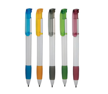 Ring Ballpen. White barrelled ballpen complete with colour rubber grip and matching translucent ring and clip. Printed 1 colour only - Black Ink Refill - Price includes 1 colour print 1 Position