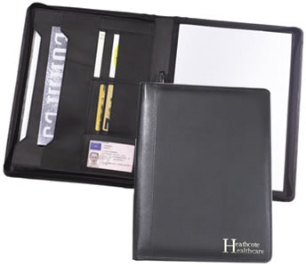Great value real leather A4 zip-round folder with A4 pad and pen included. Price includes foil Screen Print in one position