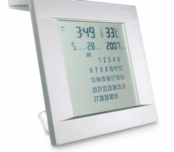 Solar dual powered desk clock in metal casing. Functions include thermometer, alarm and perpetual calendar. Button cell battery included.