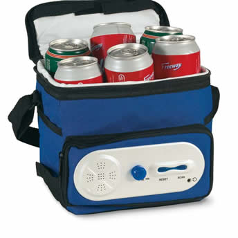 Cooler bag with FM radio. 600D polyester. 3 AA batteries not included.