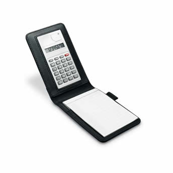 Bloc note with calculator in PU folder. 20 page notebook. 1 cell button battery included.